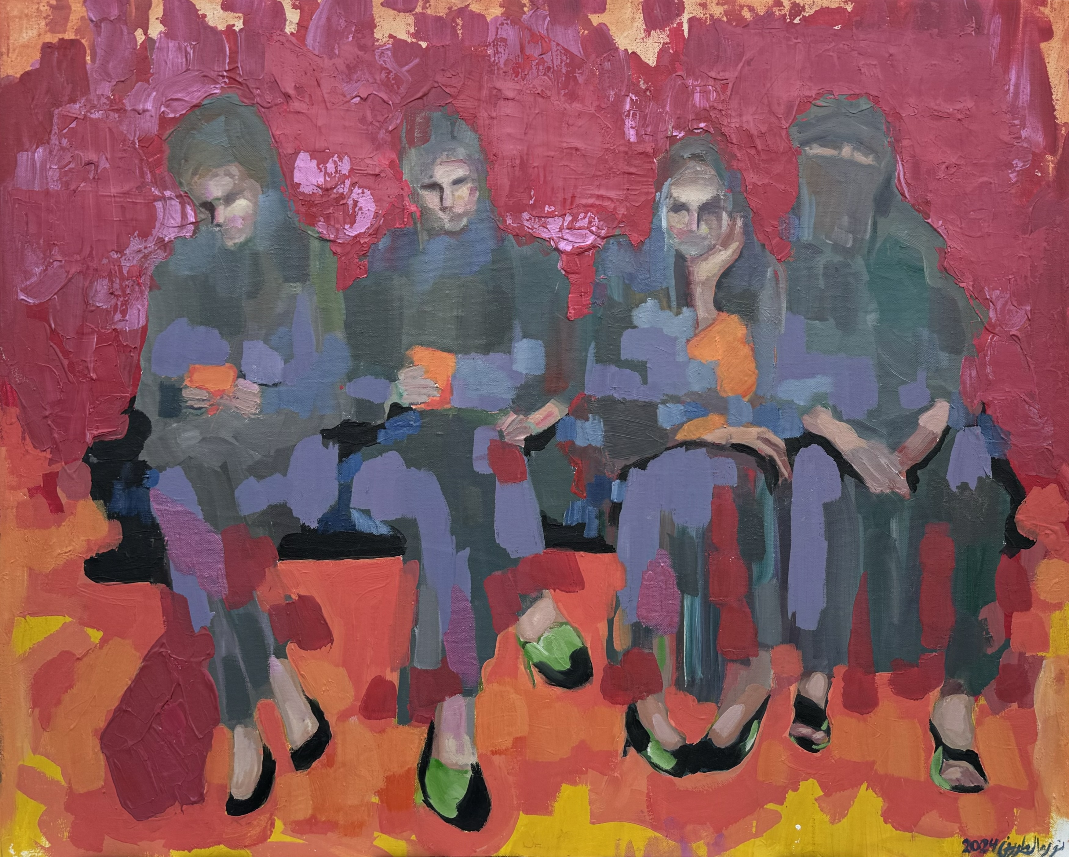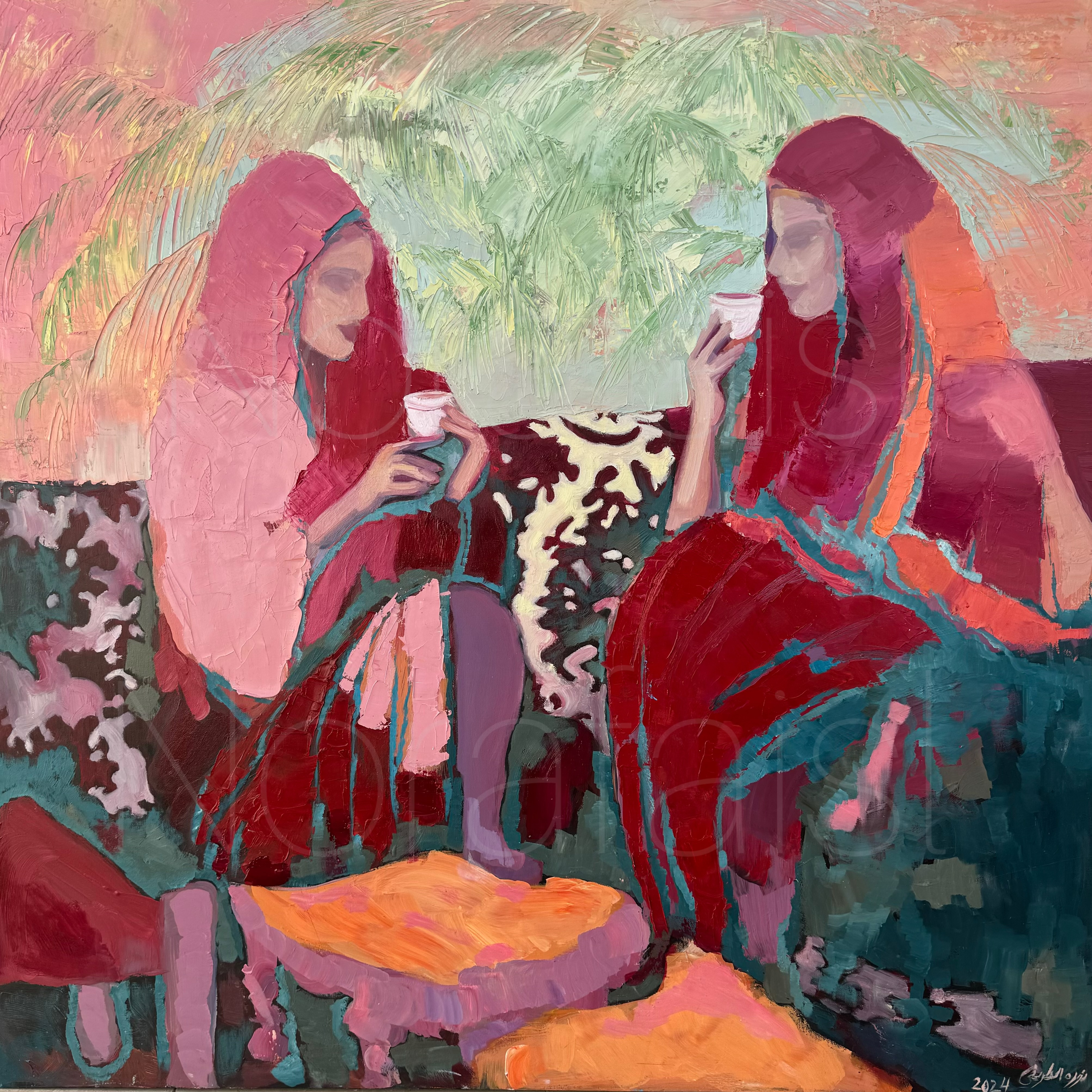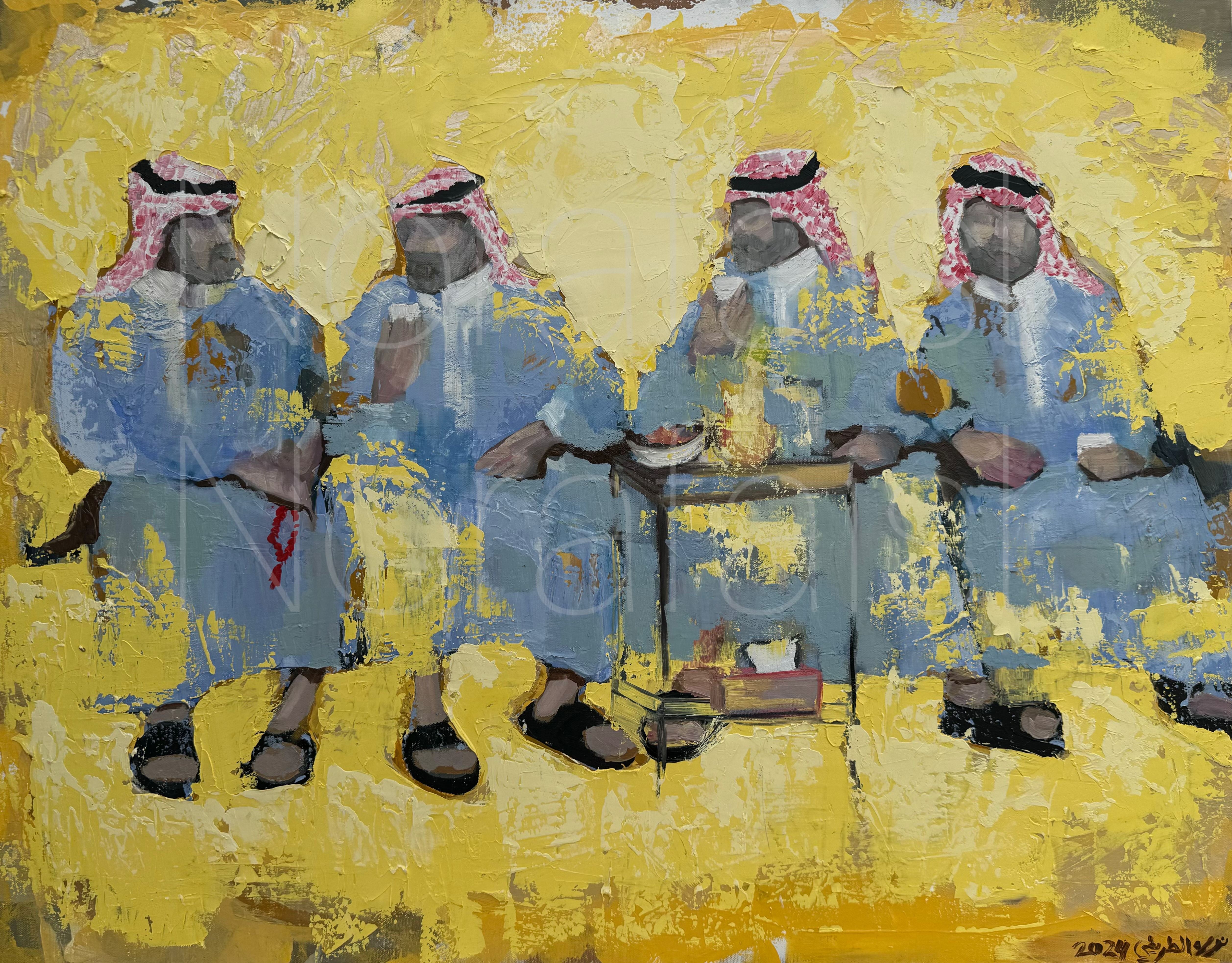 لحظة تأمل جماعي مشهد يومي من حياة النساء في سياق اجتماعي محدد . التركيز على النساء قد يبرز قوة العلاقات أو الترابط الثقافي، خصوصاً إذا كان العمل مستوحى من البيئة السعودية. الألوان الحارة قد تشير إلى دفء هذه العلاقات أو التقاليد.