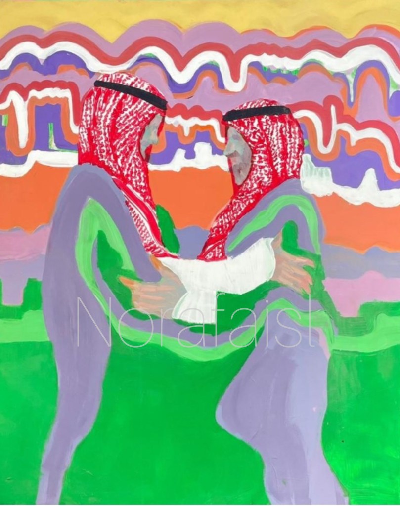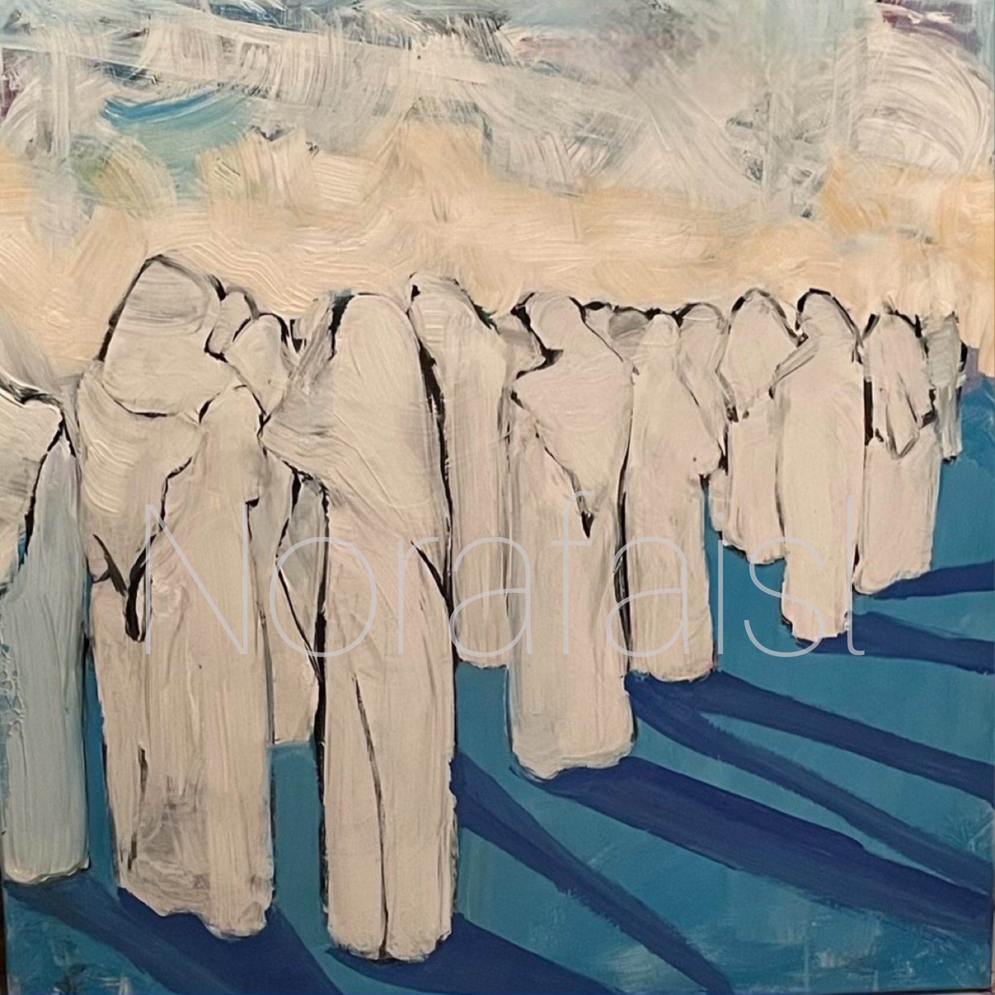 اللون الأبيض في اللباس التقليدي السعودي يشير إلى الطهارة ، مما يبرز الروح الثقافية. أما الظلال الزرقاء، فهي تضيف بُعدًا بصريًا جميلًا وتخلق توازنًا ديناميكيًا في اللوحة.