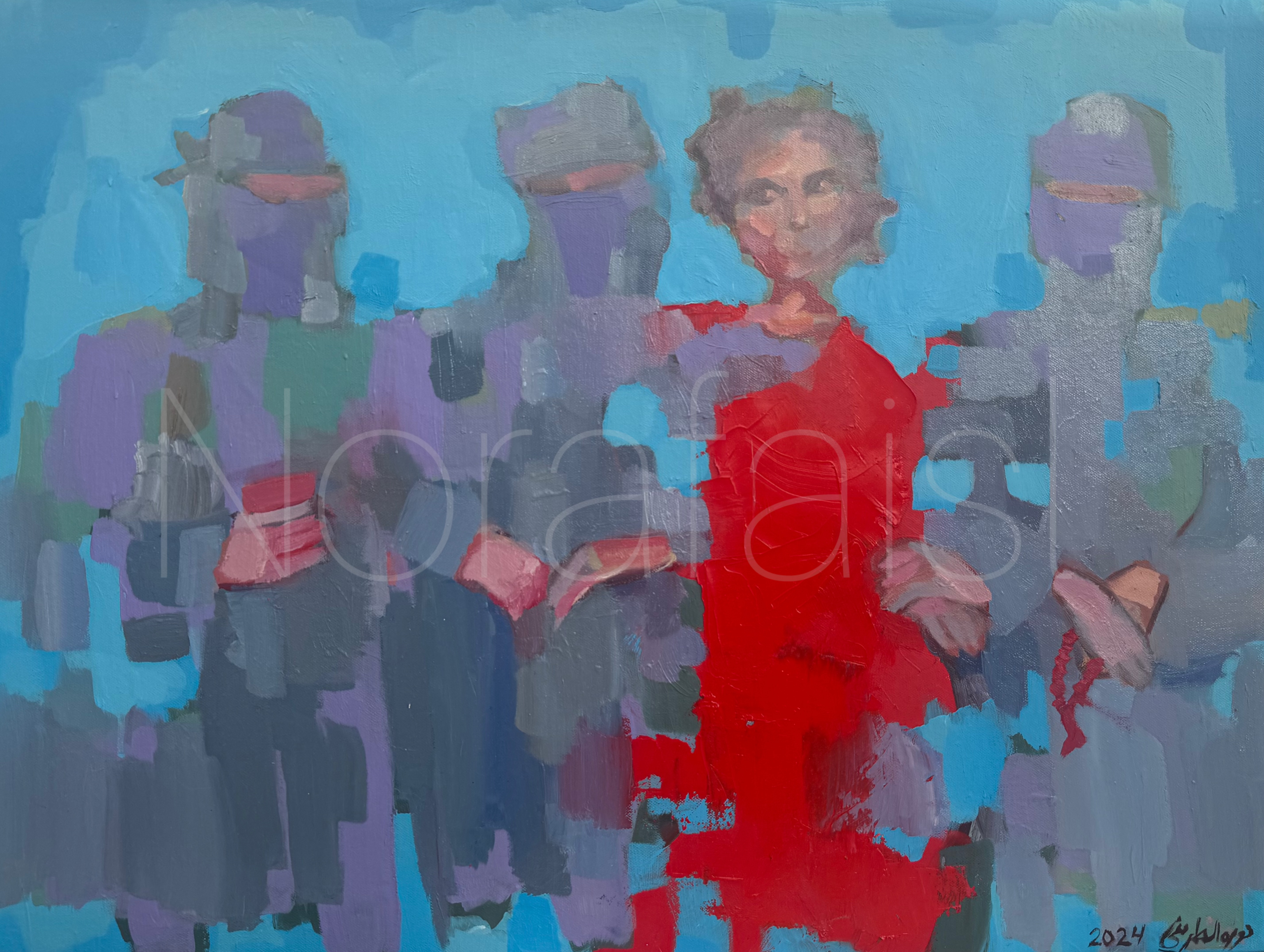 المرأة باللون الأحمر تجسد القوة والثقة، في حين أن الشخصيات المحيطة بها، بألوانها الأكثر كتمًا، تخلق شعورًا بالتأمل أو المساندة. اللوحة تعكس قصة وًفكرة واضحة، ورسالة عن الهوية أو الانتماء.